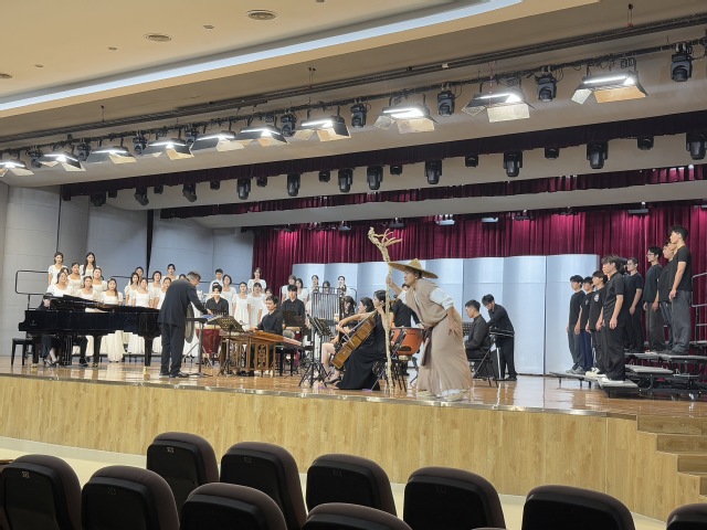 在音乐厅的文艺演出观摩环节,学院师生为文联领导带来了一场别开生面的表演。学院声乐教研室主任张芳芳老师以一首《美妙的歌声随风飘荡》(钢琴伴奏:黄彦琪)惊艳全场,仿佛走进了典雅高贵的古罗马。随后,由副院长夏炎彬副教授编创并指挥的民族管弦乐情景音画诗《粤调·彩云追月》,以岭南乐曲为基础,巧妙融合传统民乐与现代艺术。该作品由我院专业教师李遥、魏茜、王喻波、王雯琦、廖梦婷、范榕仪、谢华林、王念祖、黄泰龙、李桢奇等,携手合唱团及民乐团,以戏剧性叙事方式进行舞台呈现,现场反响热烈,掌声雷动。