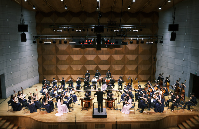 音乐会曲目编排兼具传统底蕴与时代活力,堪称一场跨越古今的音乐对话。开场中国打击乐重奏《古风》以磅礴气势震撼全场,由珠海科技学院与星海音乐学院联合打击乐团共同演绎;古筝与室内乐《桃花源》经廖梦婷老师改编焕发新韵,唢呐独奏《百鸟朝凤》再现自然生灵的灵动图景。客家筝曲《崖山哀》由广东客家筝传人饶蜀行与王念祖老师筝箫合奏,尽显汉调筝曲的独特韵味;扬琴独奏《狂想曲》、古筝重奏《行者》等作品,展现了民族乐器与现代音乐的创新融合。